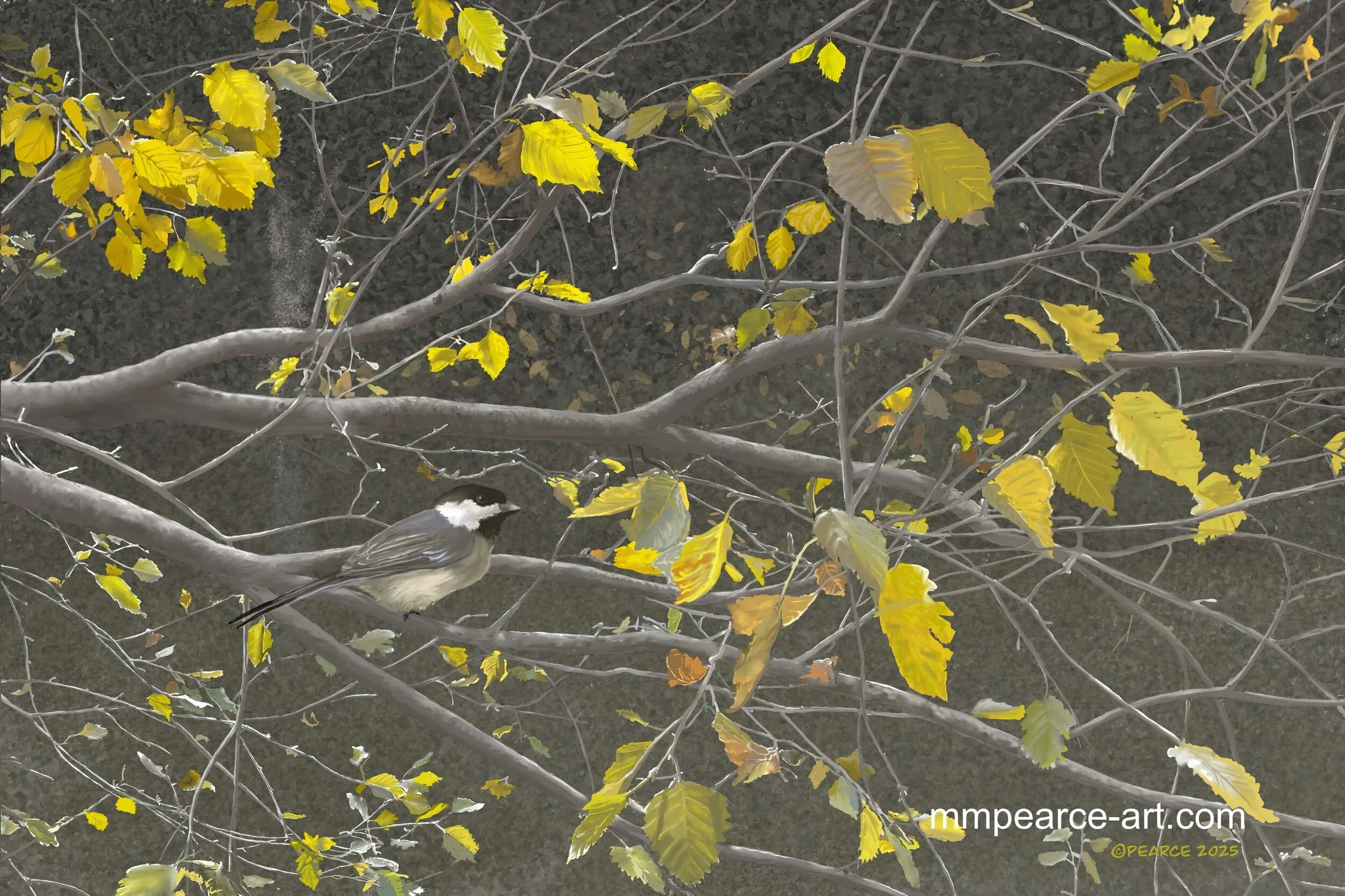 A black-capped chickadee sits among the still vibrant fall leaves of a river birch. This small, non-migratory songbird is common year around in the northern United States and Canada. This was painted with digital paint using an iPad, Procreate and an Apple Pencil. The finished painting took 63 hours and 92,000 brush strokes.