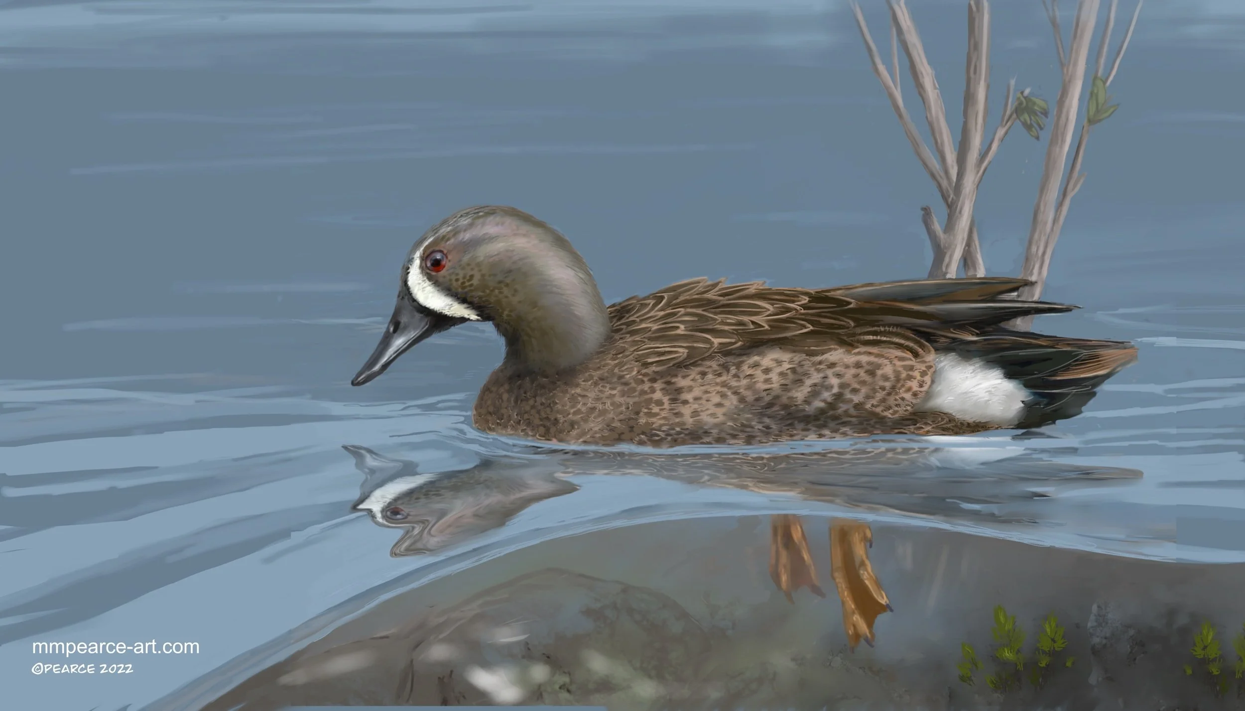 These dabbling ducks are quite common and fairly small. They get their name from a powdery blue patch on their upper wing coverts. The finished painting took 25 hours and 68,354 brush strokes.