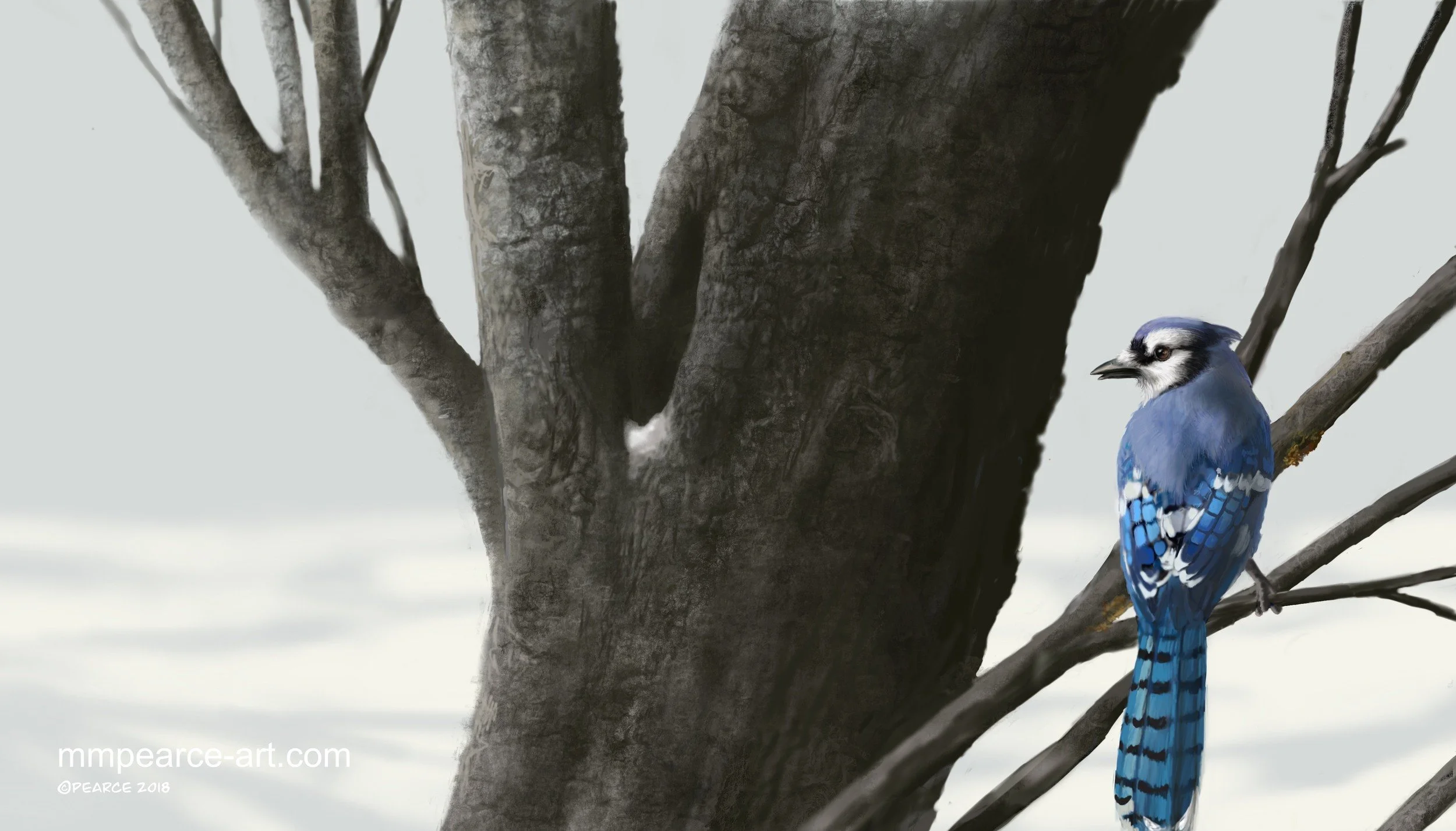 Blue Jays feed on seeds and acorns and have been known to hide their food. They are fairly aggressive to other birds and can be quite noisy. Their blue coloration is not due to pigments but to light interference from the structure of their feathers. This was painted with digital paint using an iPad, Procreate and an Apple Pencil. The finished painting took 21 hours and 22,940 brush strokes.