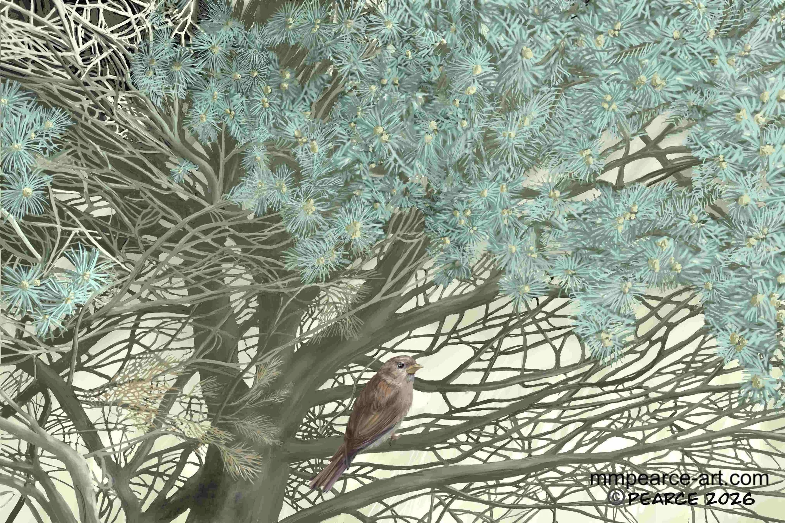 Female cardinals are more muted than the bright red males. They have a large range, covering the eastern half of the United States and into the Central American region. They mainly eat seeds and are non-migratory. They were once prized as pets, but that is prohibited by Migratory Bird Treaty Act of 1918. This was painted with digital paint using an iPad, Procreate and an Apple Pencil. The finished painting took 16 hours and 37,400 brush strokes.