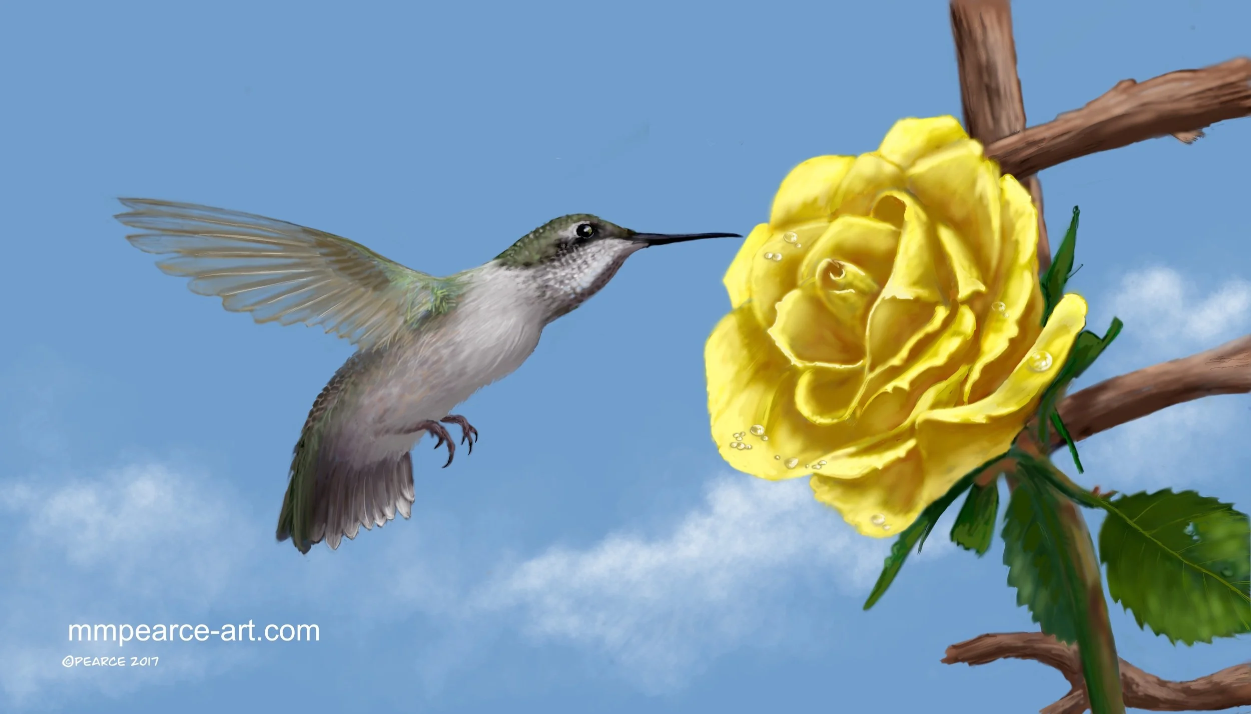 This tiny bird is a female Ruby-throated hummingbird. The female lacks the bright red patch which I thought wouldn’t blend well with the yellow rose. She is not after pollen with a rose, but the dew drops. This was painted with digital paint using an iPad, Procreate and an Apple Pencil. The finished painting took 24 hours and 30,323 brush strokes.