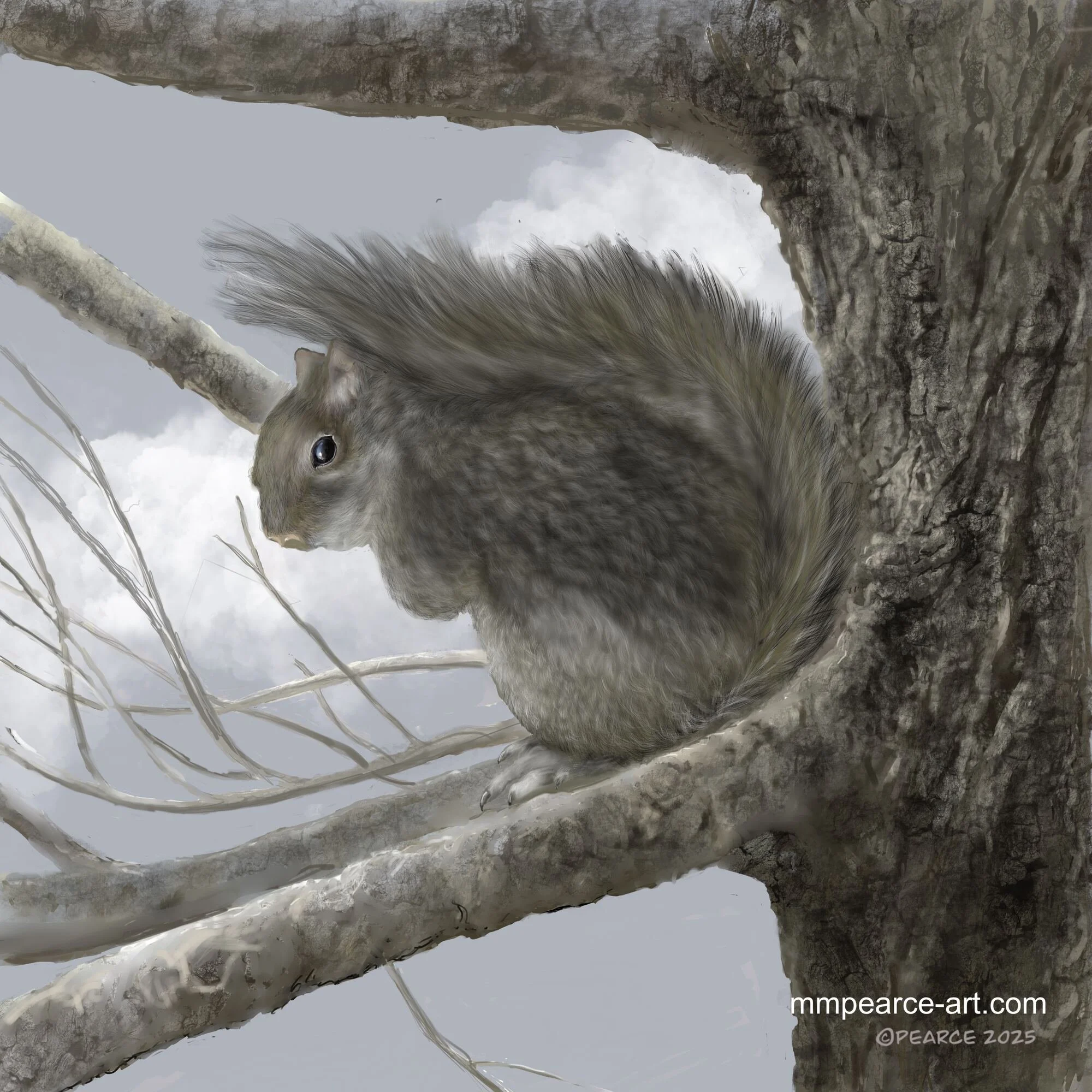 Gray squirrels are agile and fast, reaching speeds up to 20 mph. They have twig and leaf-filled nests high up in trees (called dreys) which they use year round. Other gray squirrels shelter in tree cavities. This painting was done with iPad, Procreate and an Apple Pencil. The finished work took 13.5 hours and 40,500 brush strokes.