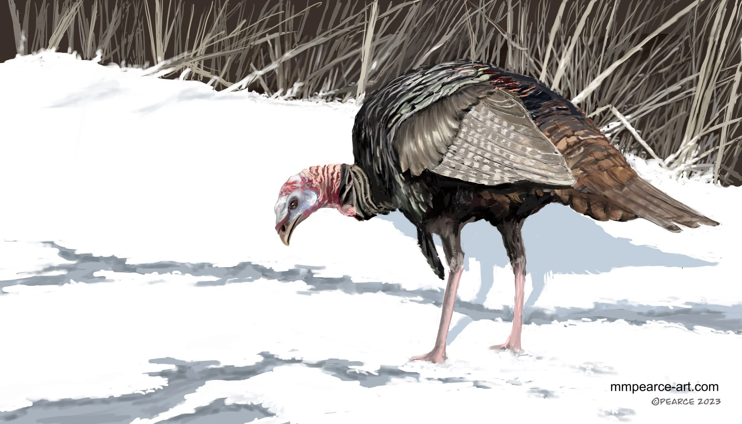 Turkeys forage on grass, seeds, berries insects and even frogs and snails. The finished painting took 9 hours and 19,743 brush strokes.