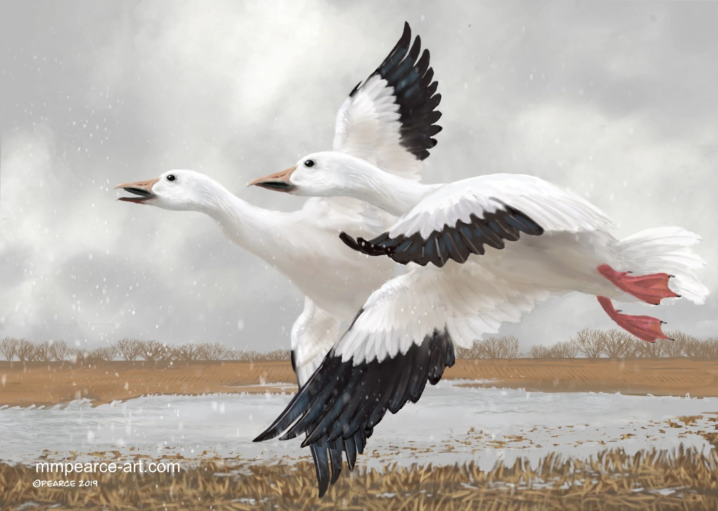 Snow geese are often seen in flocks, breeding in the far north and wintering in warmer parts of North America into Mexico. This was painted with digital paint using an iPad, Procreate and an Apple Pencil. The finished painting took 22 hours and 26,533 brush strokes.